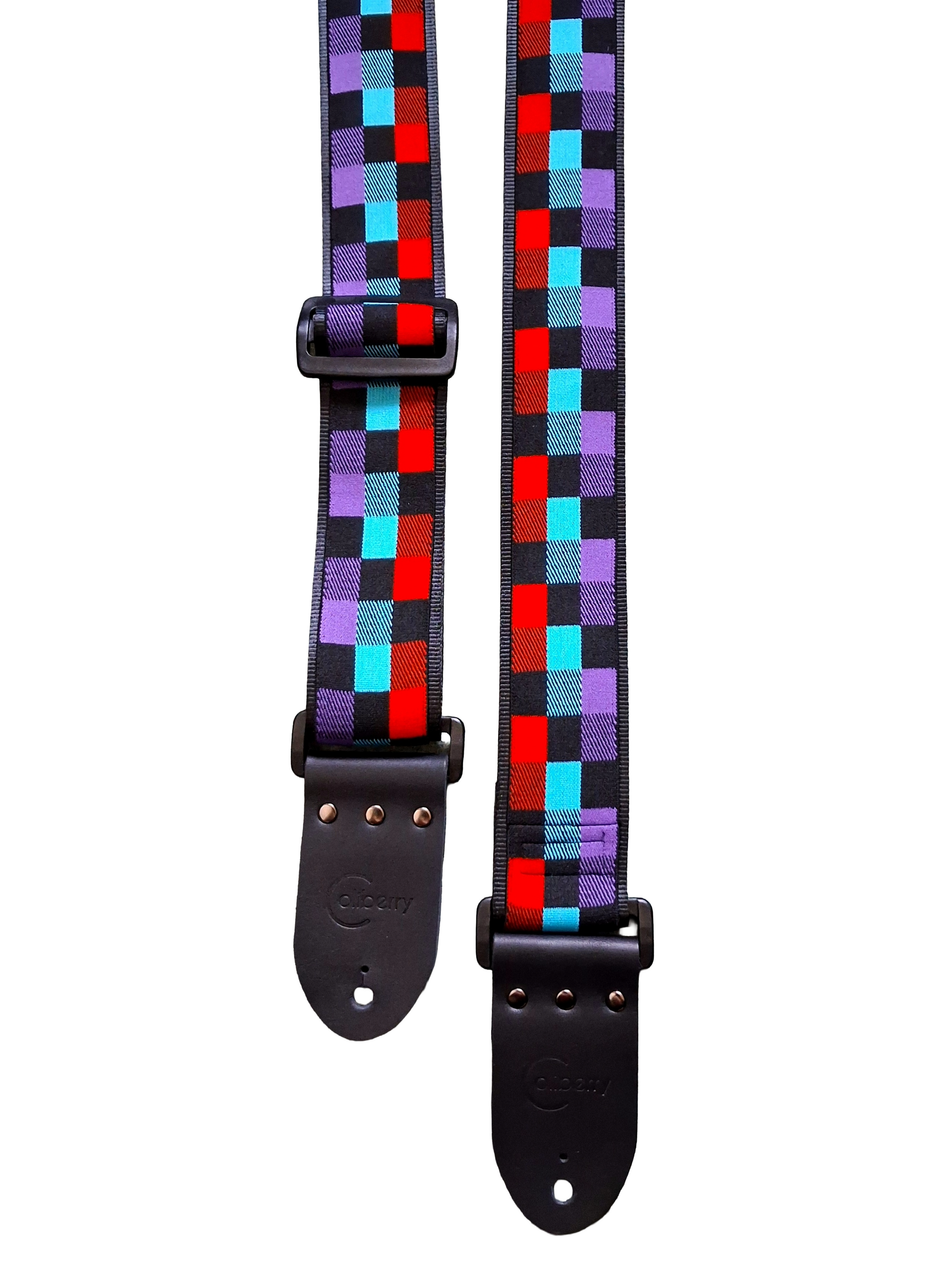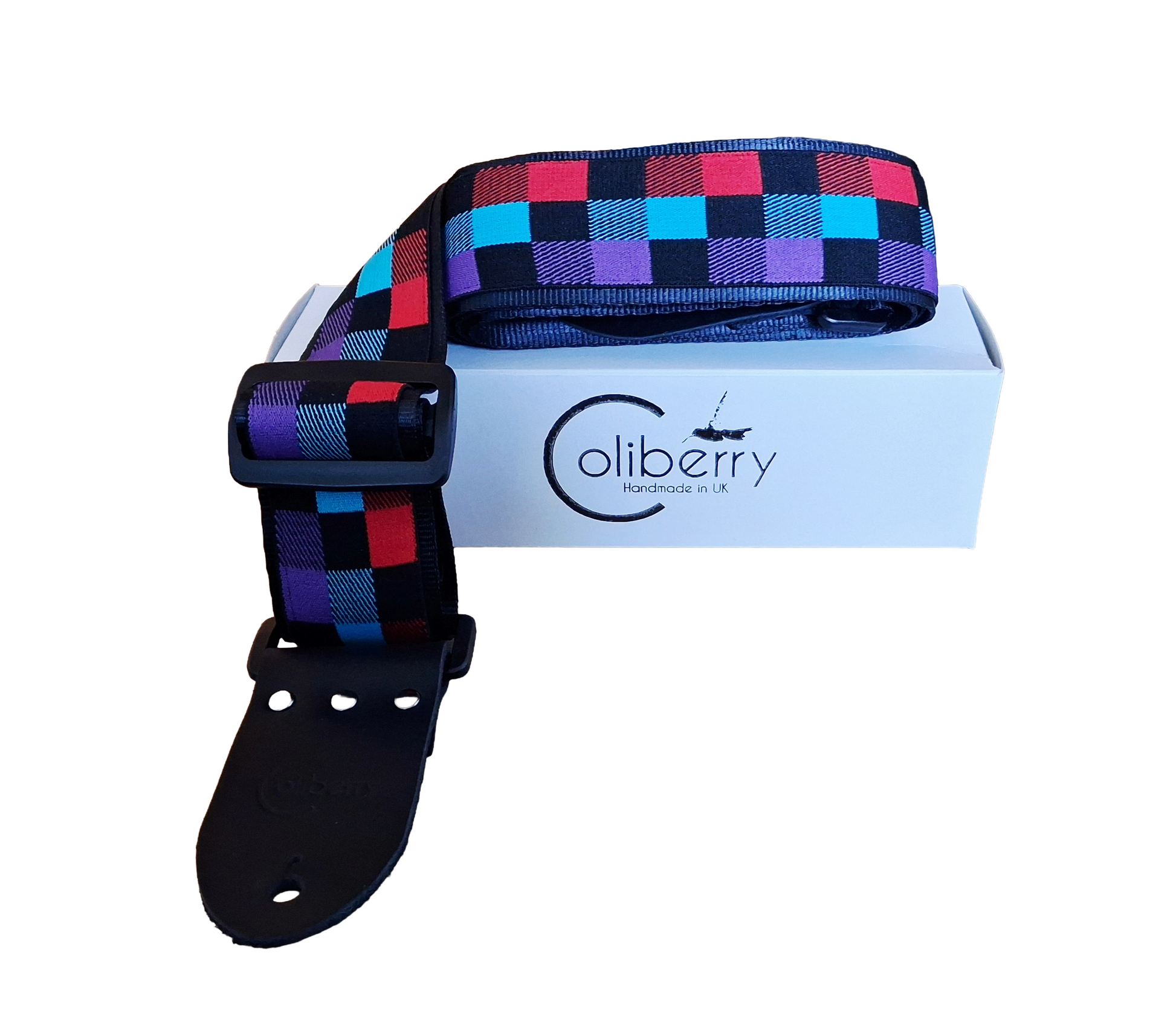Handmade Chromatix Guitar Strap: vivid multicolour boxes pattern Jacquard Ribbon with Leather Ends. Adjustable.