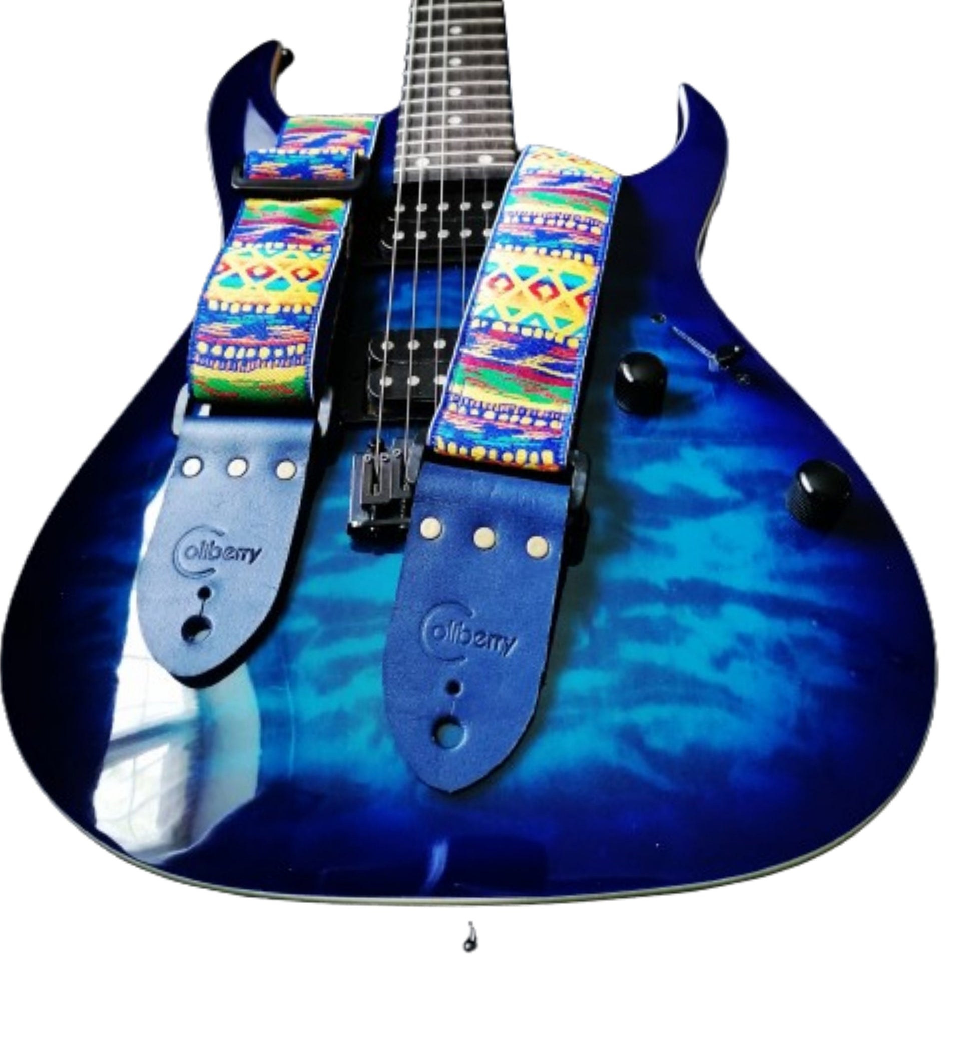 Handmade guitar strap - soft, comfortable and strong. Will suit any guitar either it's acoustic, electric or bass. Made of: FISTRAL Guitar Strap with bright multicolored Jacquard Ribbon to the front and Royal Blue Seatbelt strap backing. Midnight Blue colour Real Leather ends (thickness 3mm) with 3 rivets on each. Plastic 3 bar slider and 2 loops. Size: Wide: 50mm Long: Adult size, adjustable from 90cm to 150cm. Each strap comes with its own box (as seen on photos). We made our best to show colours as they are but it might slightly vary from photos due to light and screen settings. Please note guitars on pictures are used for display purposes only and are NOT included in any offer. Please do not hesitate to contact me if you need any further information. Enjoy shopping and Rock On. πΈπ€ποΈπ€πΈ