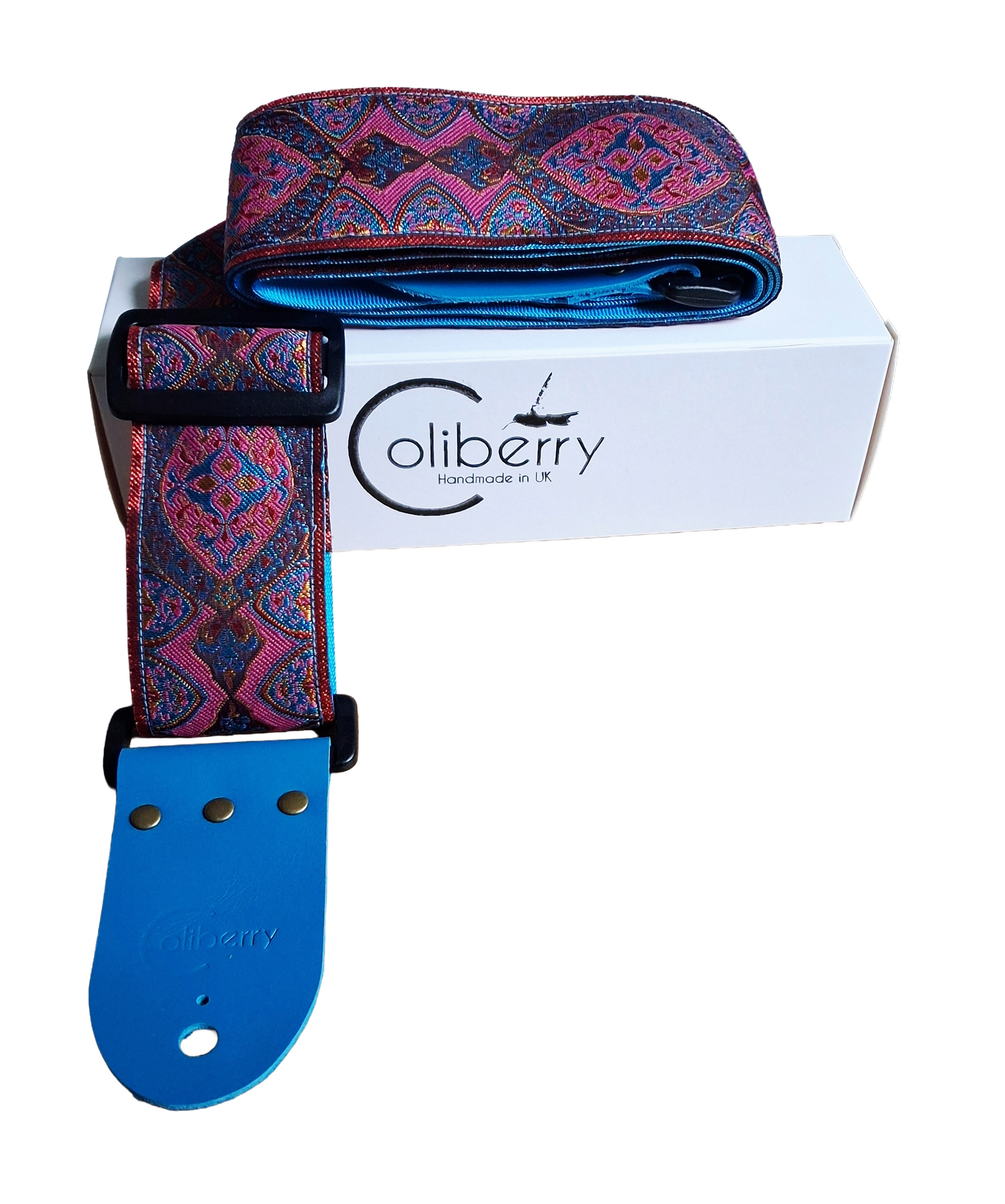 Handmade 'Pink Sunbeam' guitar strap with Kingfisher Blue real leather ends.